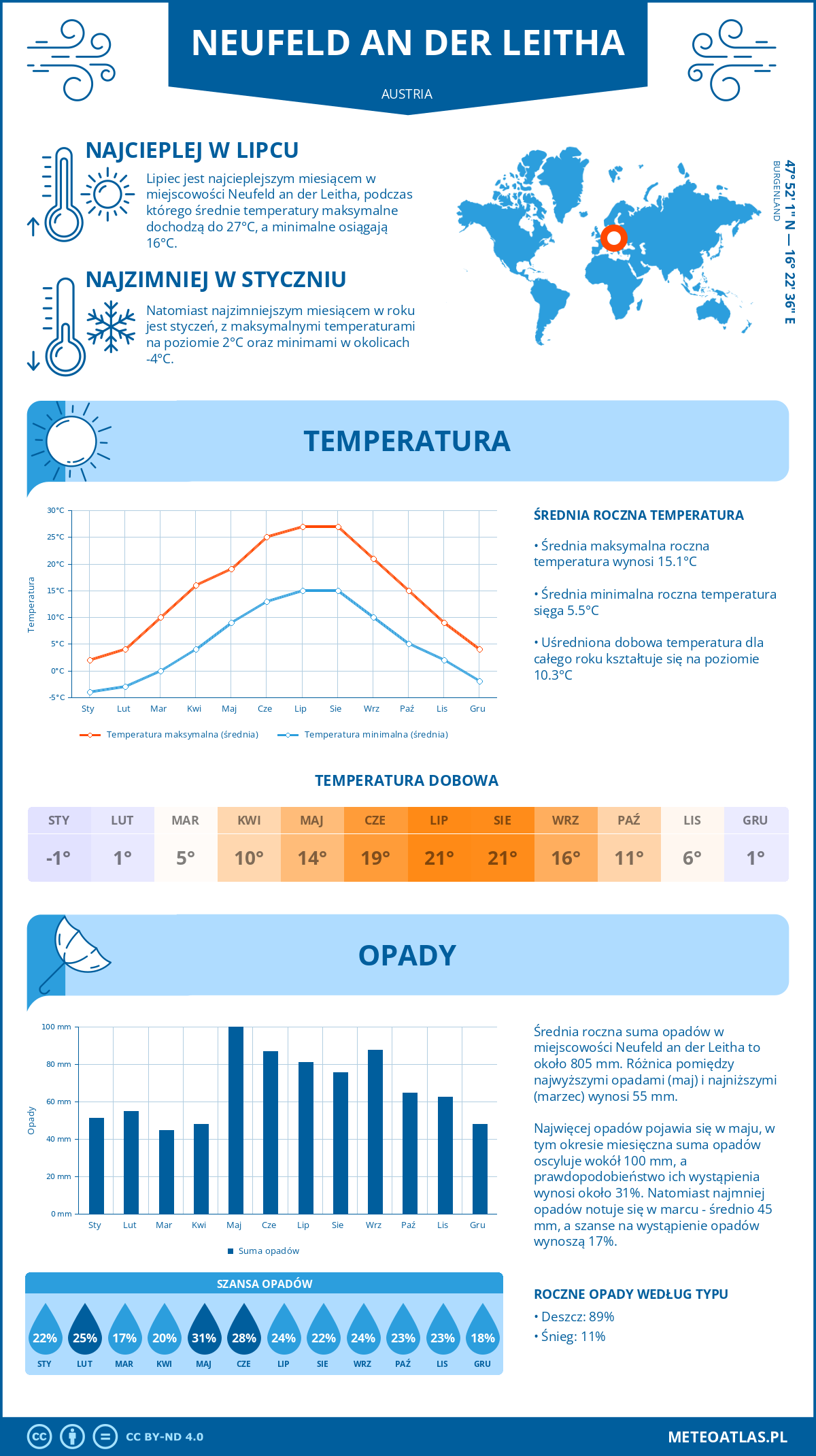 Neufeld an der Leitha (Austria) - pogoda i klimat: roczne średnie temperatury i opady