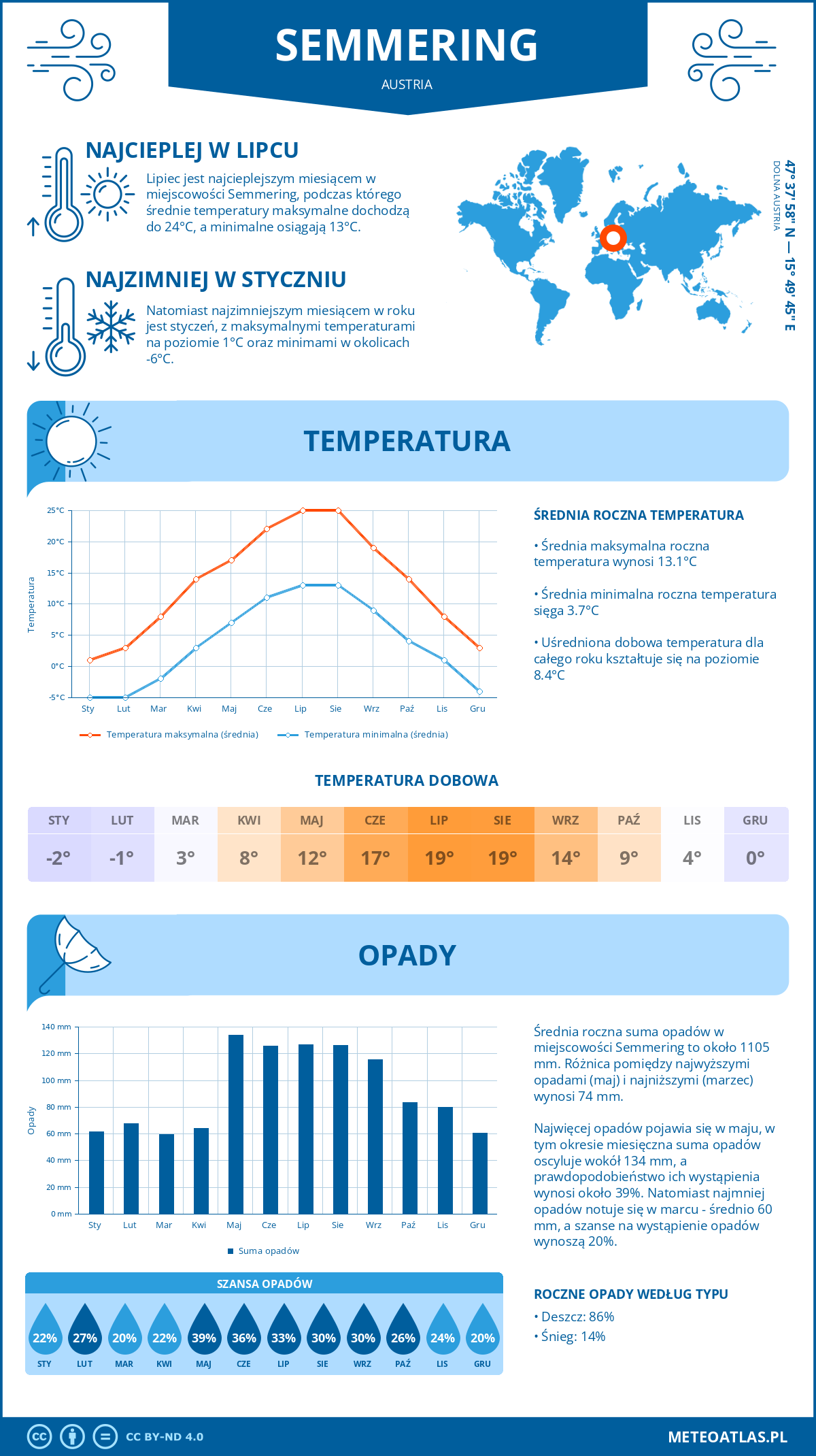 Semmering (Austria) - pogoda i klimat: roczne średnie temperatury i opady