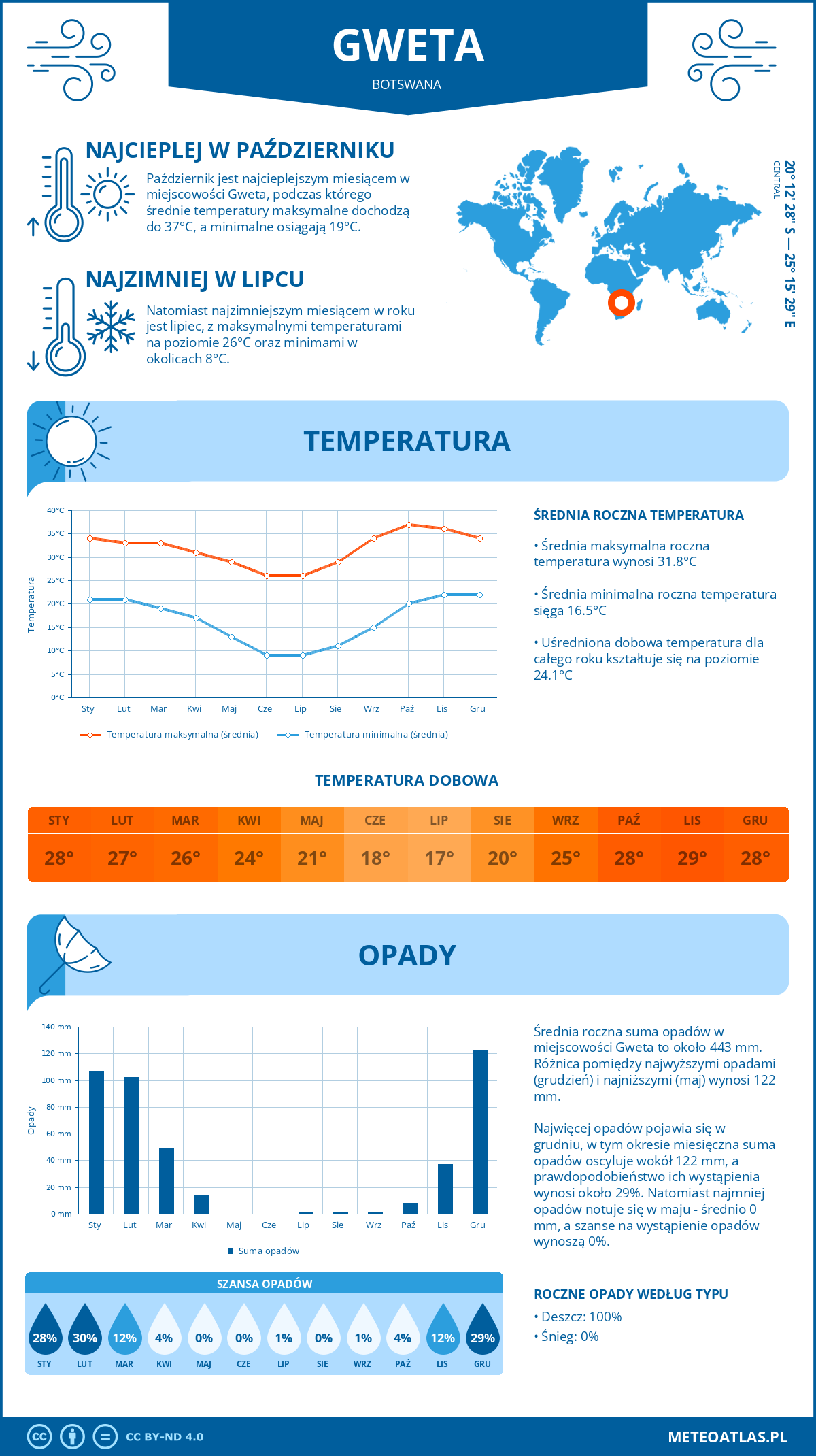Gweta (Botswana) - pogoda i klimat: roczne średnie temperatury i opady