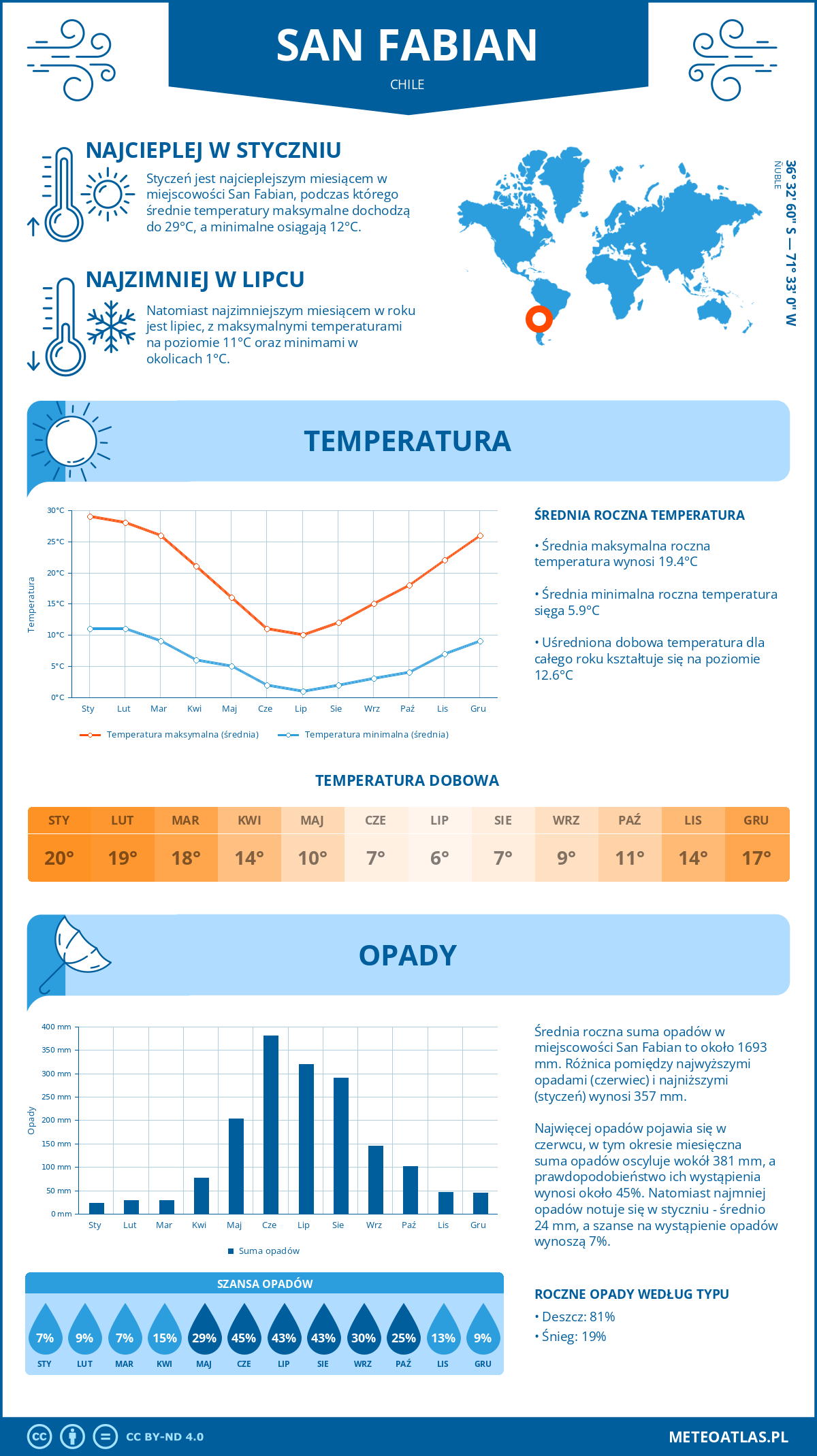 San Fabian (Chile) - pogoda i klimat: roczne średnie temperatury i opady
