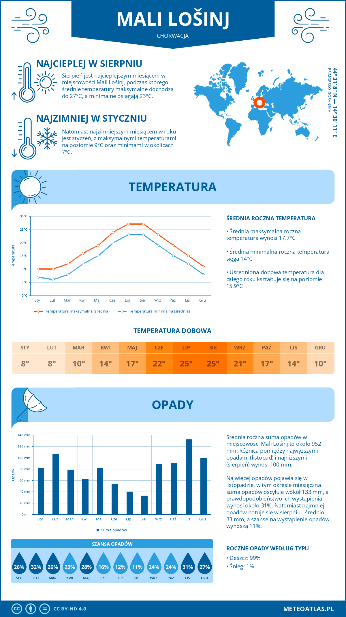 Mali Lošinj (Chorwacja) - pogoda i klimat: roczne średnie temperatury i opady