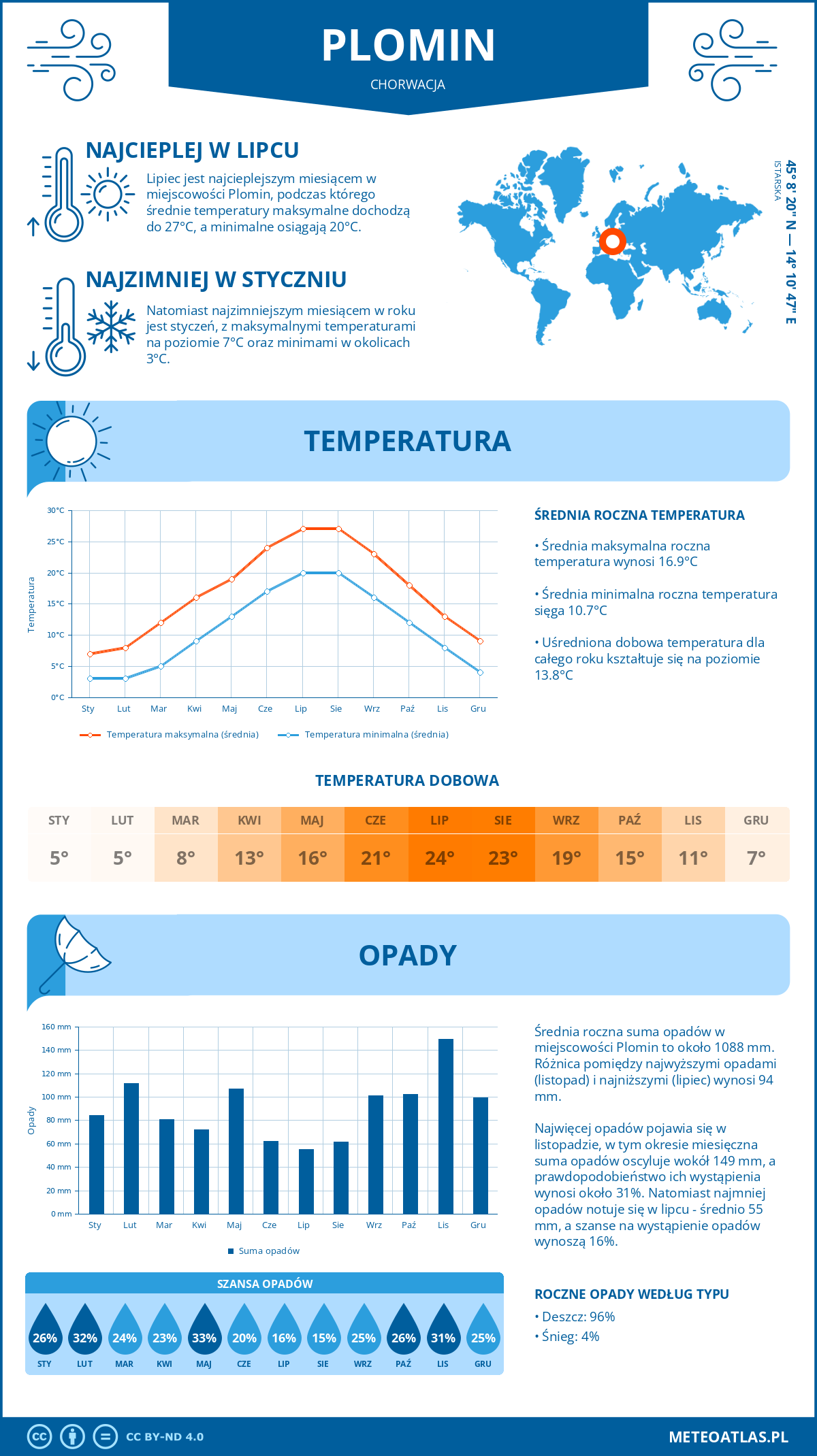 Plomin (Chorwacja) - pogoda i klimat: roczne średnie temperatury i opady