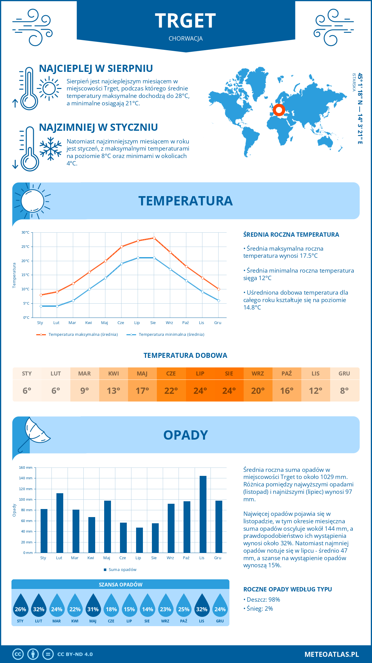 Trget (Chorwacja) - pogoda i klimat: roczne średnie temperatury i opady