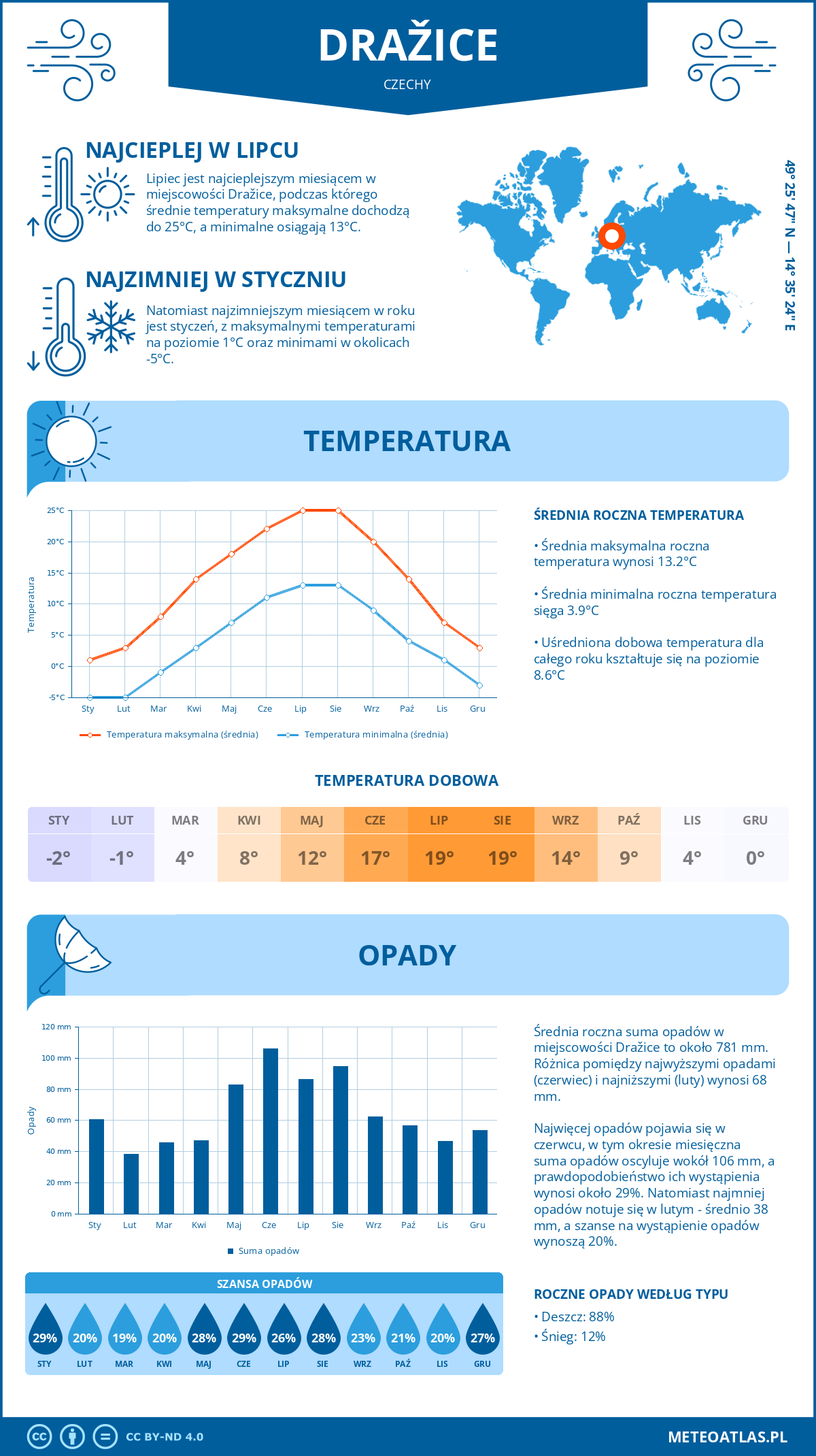 Dražice (Czechy) - pogoda i klimat: roczne średnie temperatury i opady