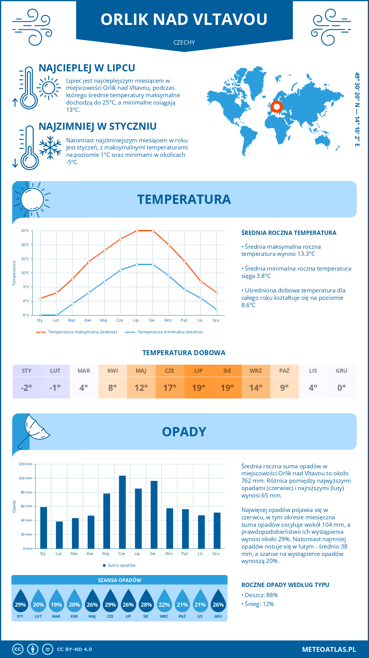 Orlik nad Vltavou (Czechy) - pogoda i klimat: roczne średnie temperatury i opady