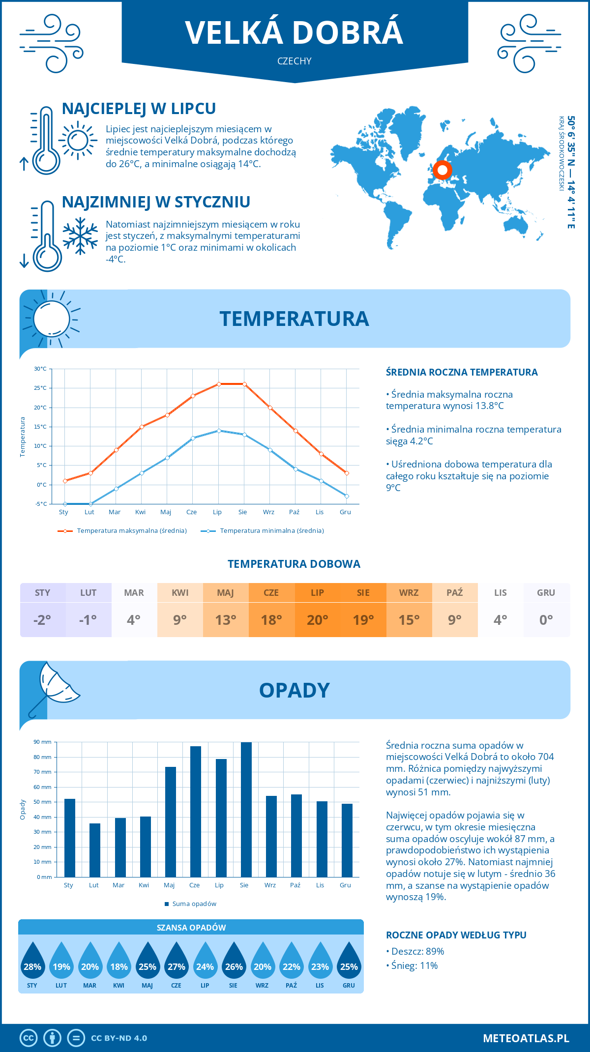 Velká Dobrá (Czechy) - pogoda i klimat: roczne średnie temperatury i opady