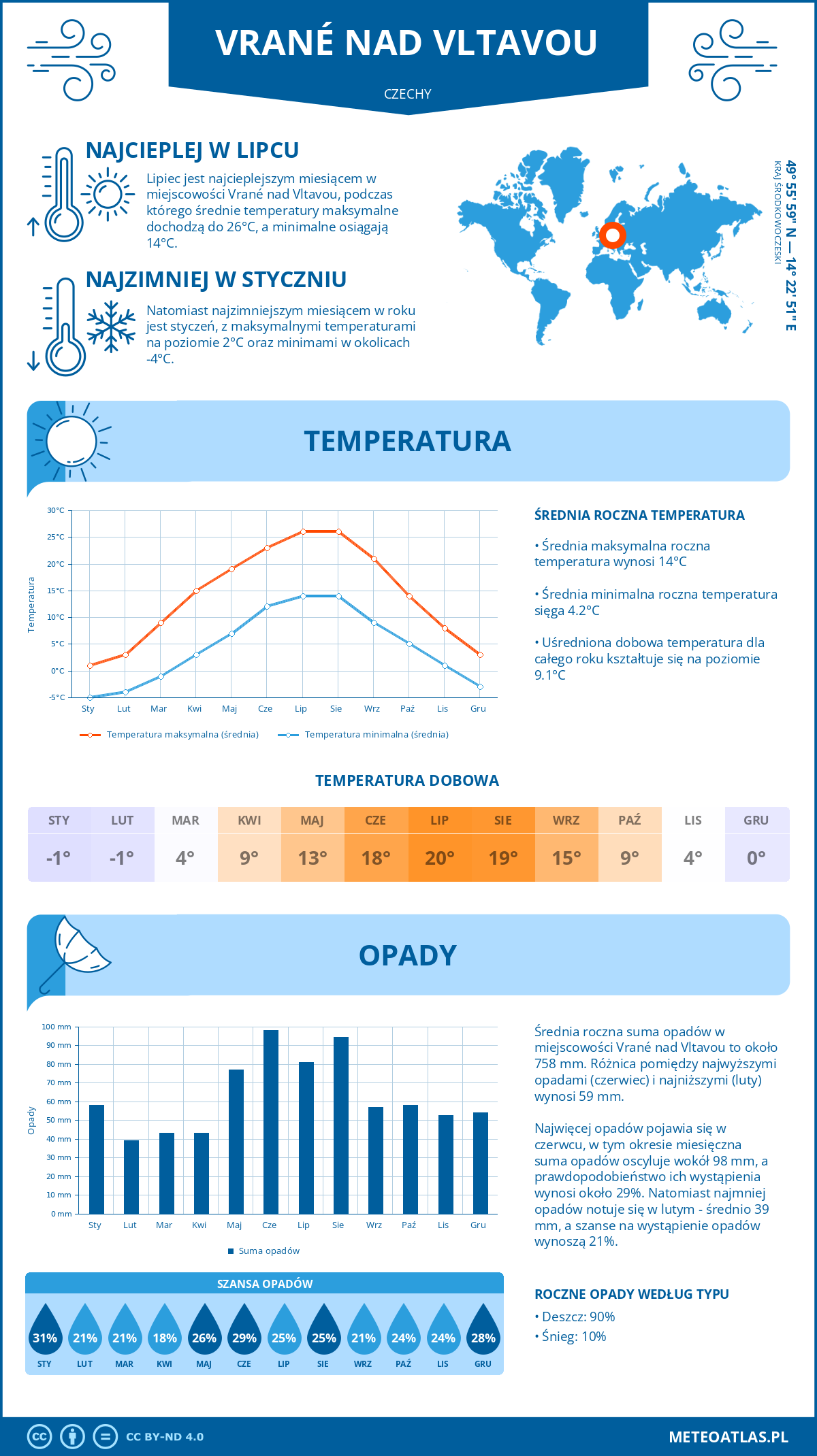 Vrané nad Vltavou (Czechy) - pogoda i klimat: roczne średnie temperatury i opady