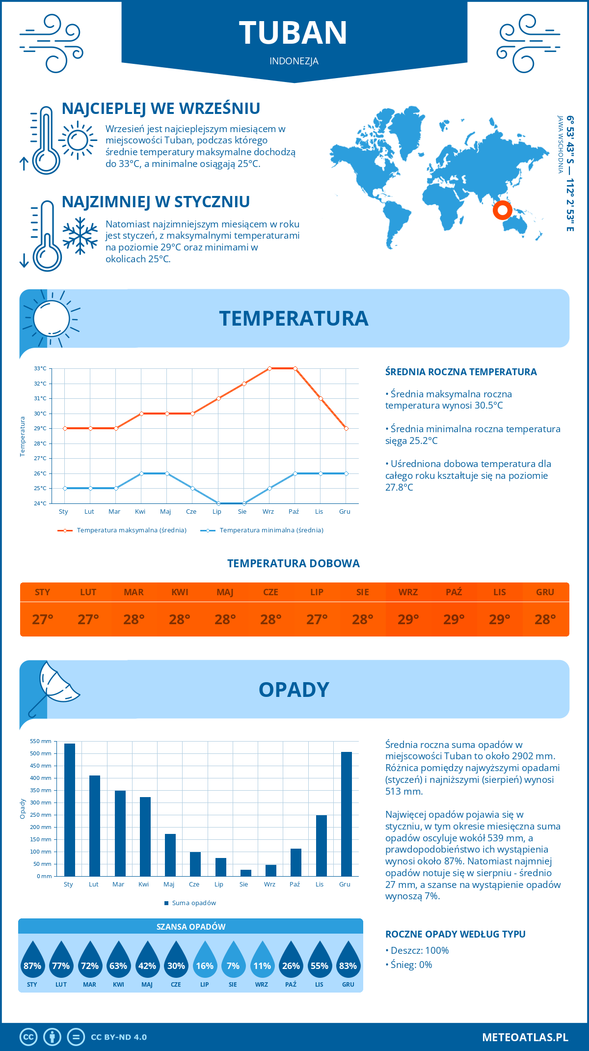 Tuban (Indonezja) - pogoda i klimat: roczne średnie temperatury i opady