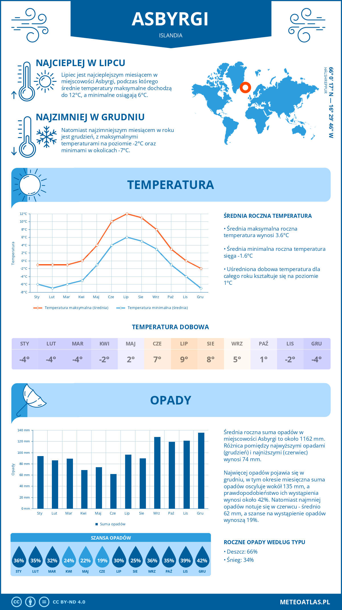 Asbyrgi (Islandia) - pogoda i klimat: roczne średnie temperatury i opady