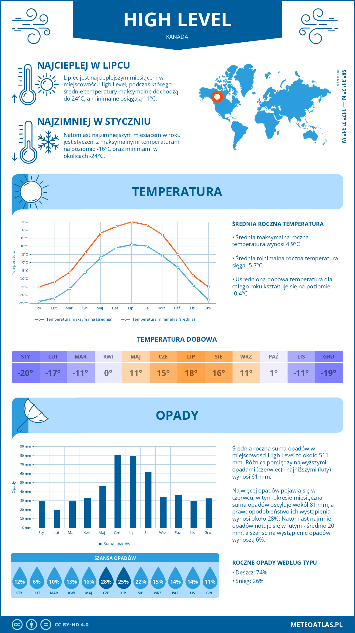 High Level (Alberta) - pogoda i klimat: roczne średnie temperatury i opady