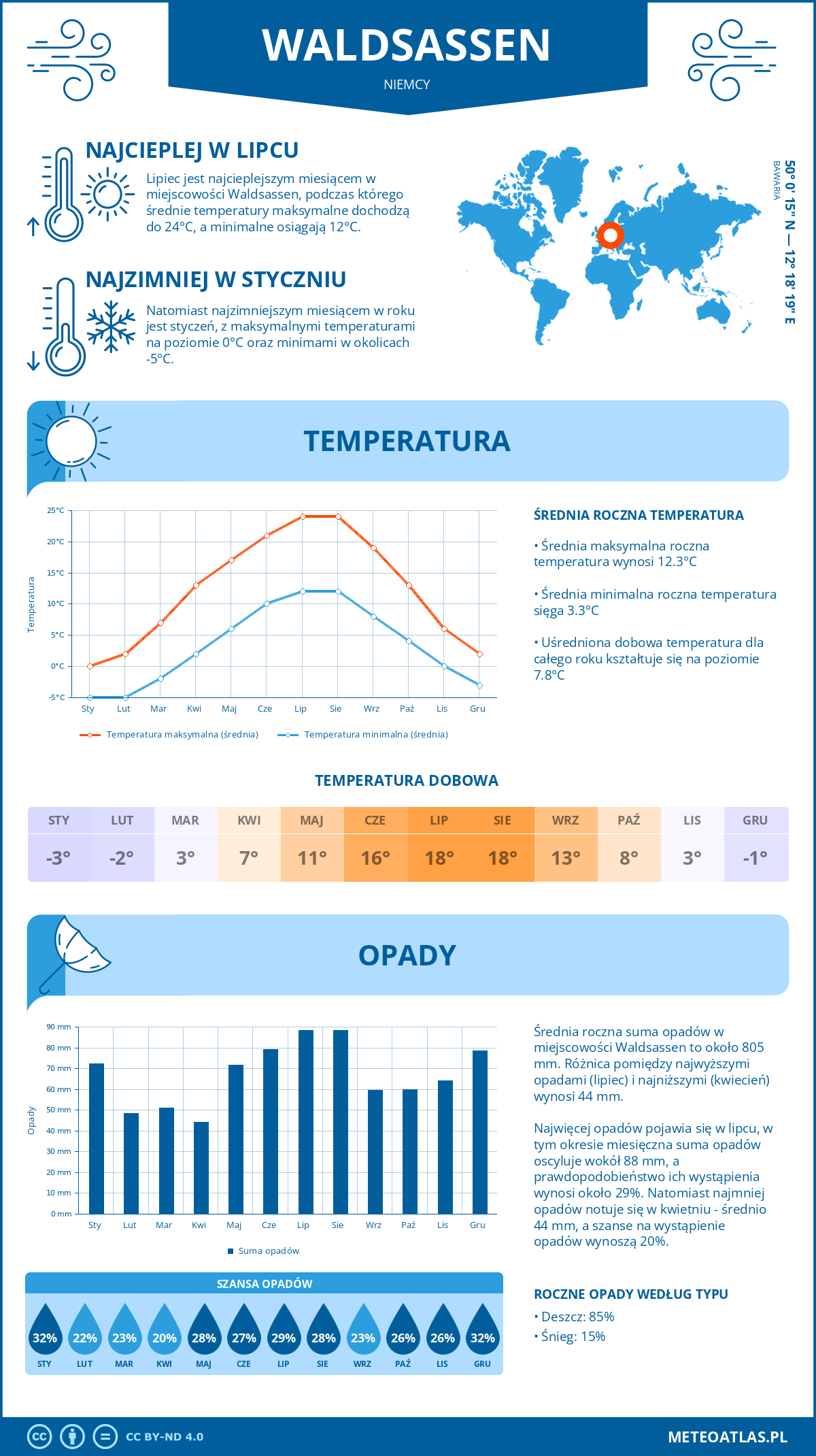 Waldsassen (Niemcy) - pogoda i klimat: roczne średnie temperatury i opady