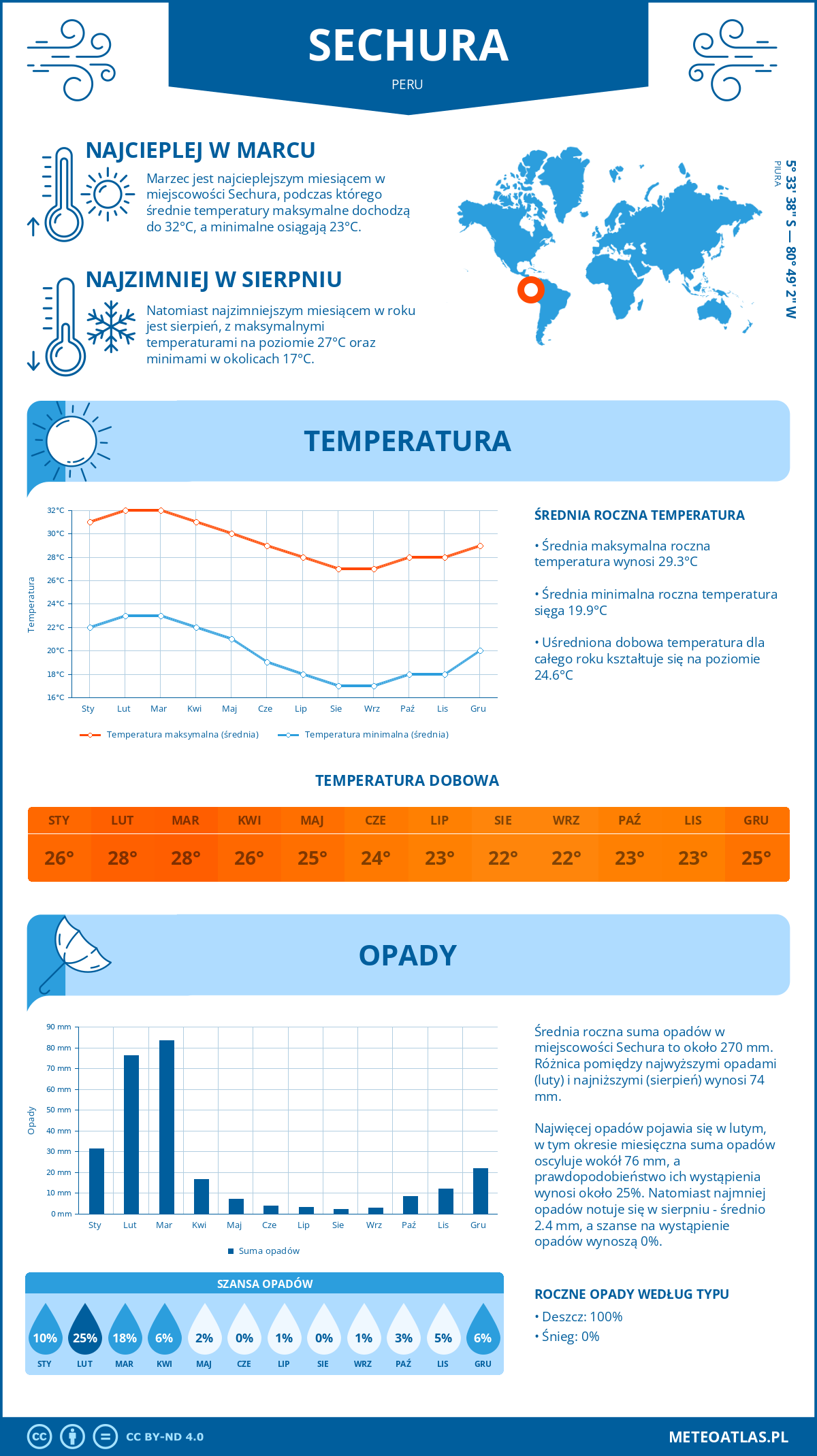 Sechura (Peru) - pogoda i klimat: roczne średnie temperatury i opady