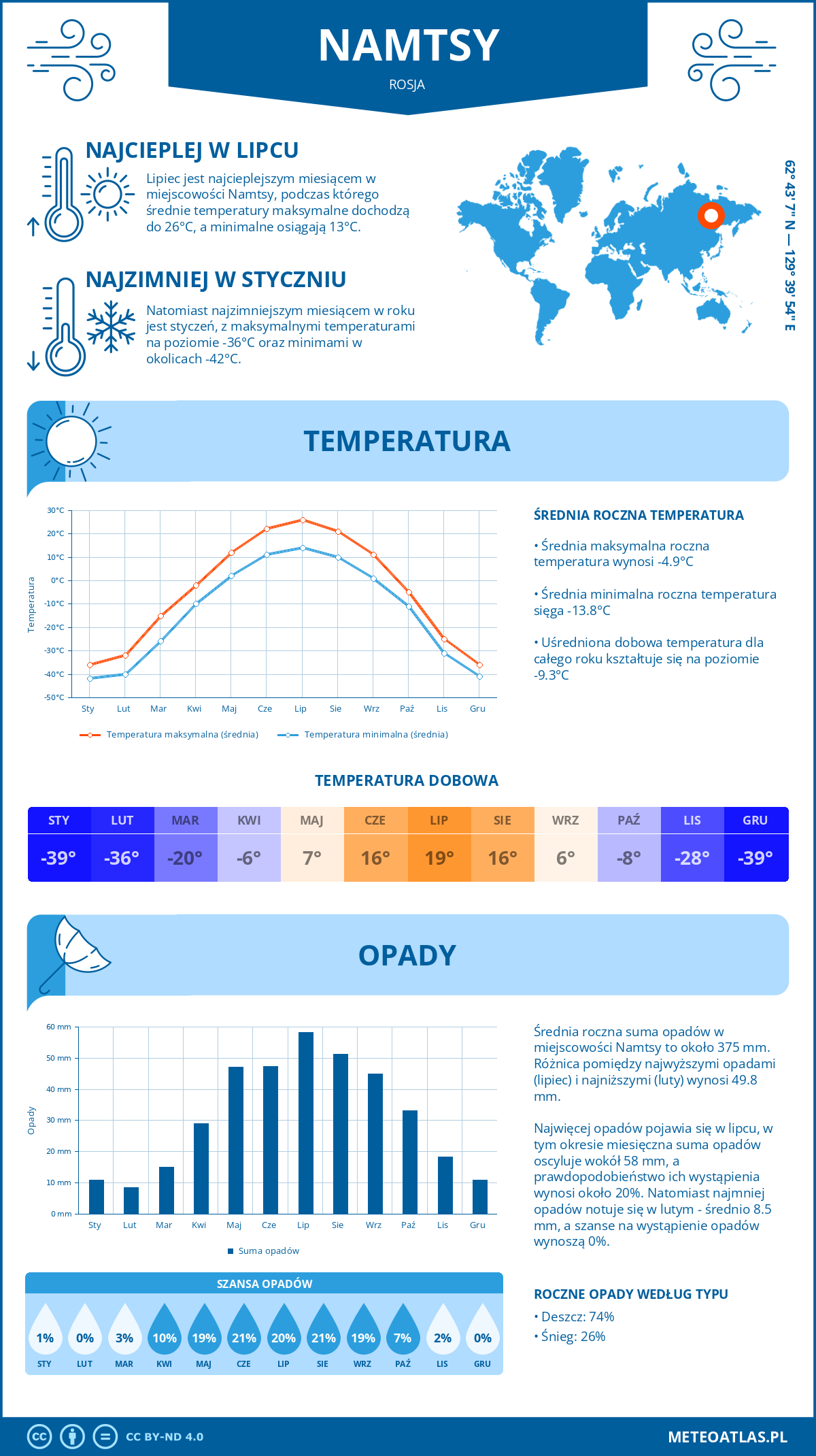 Namtsy (Rosja) - pogoda i klimat: roczne średnie temperatury i opady
