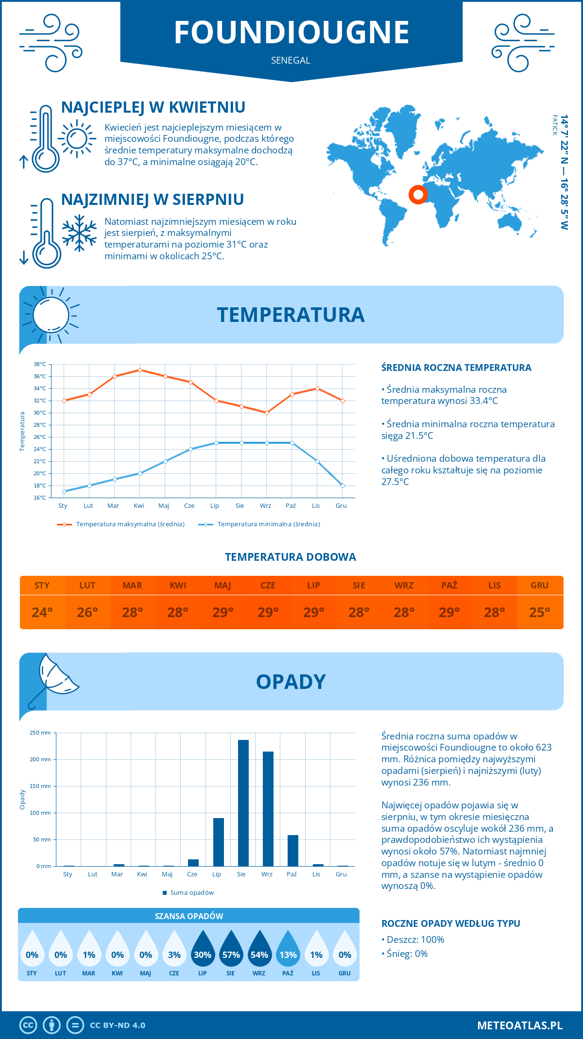 Foundiougne (Senegal) - pogoda i klimat: roczne średnie temperatury i opady