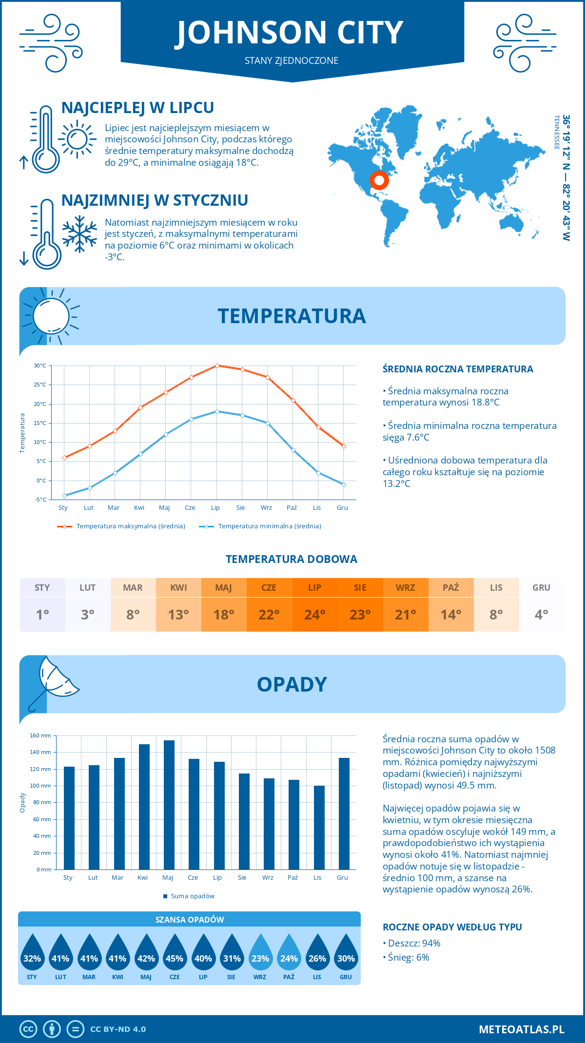 Johnson City (Tennessee) - pogoda i klimat: roczne średnie temperatury i opady